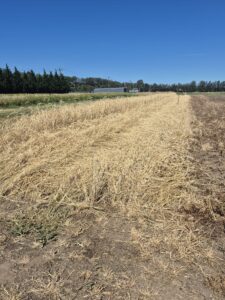 This trial follows a winter 2025 cover crop consisting of field pea and barley. The cover crop was terminated at flowering in spring using three different methods, which are being compared with a fallow control: Buffalo rolling stalk chopper, mulching, and harvest for livestock forage.